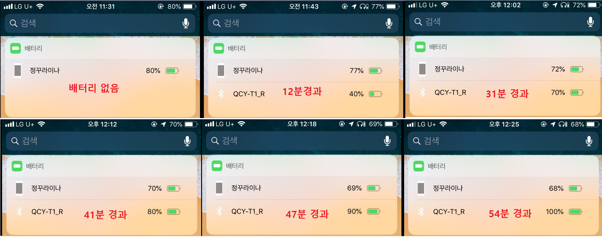 배터리가 0%인지는 정확히 알기 어렵겠지만, 배터리 사용량 테스트를 하면서 배터리가 없어서 페어링이 안되는 시점부터 충전을 테스트했다. 충전은 충전독에 넣고 중간중간 열어보면서 페어링 연결해서 배터리를 체크했으니 참고하자.