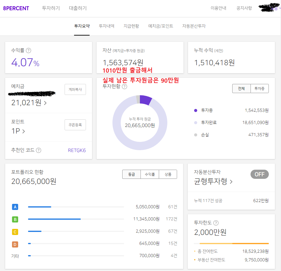투자원금이 1100 정도였는데, 최근 부도율이 높아져서 작년부터 재투자없이 통장으로 옮겼고 현재 남은 투자원금이 90만원이다. 이걸 계산하면 3년 5개월간의 총 수익금은 66만원 수준이 된다. (물론 앞으로 부도가 없다는 가정에서)