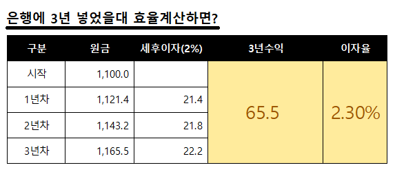 계산 편의상 3년으로 잡고 은행 복리에 세후이자로 계산해보면 실제 효율은 연이율 2.3% 수준 효율 밖에 안된다.