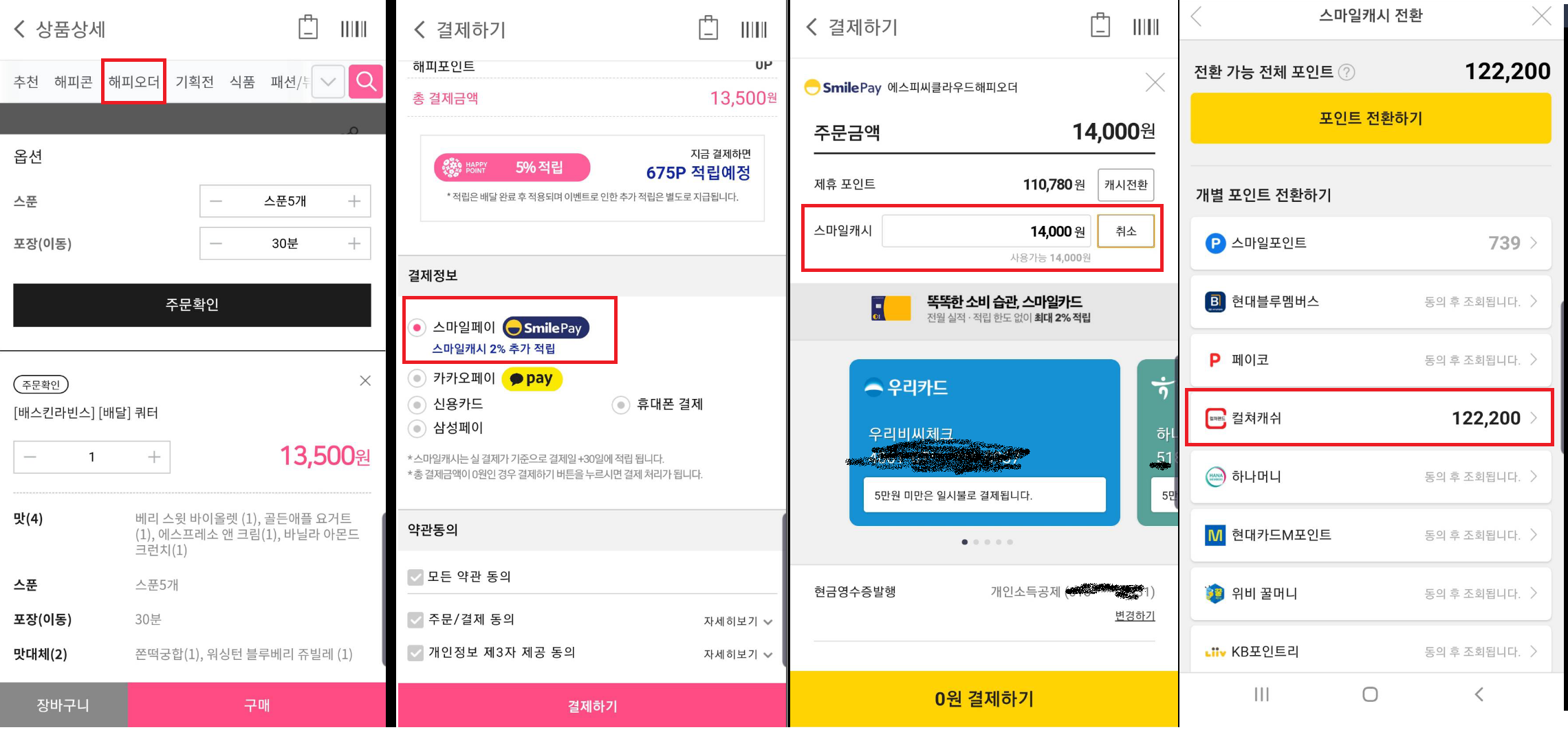 최근 알게된 꿀팁이다. 컬쳐랜드 문화상품권이 쇼핑몰에서 9% 할인판매를 하는데 이걸로 스마일캐시로 전환해서 결제하면 9%의 할인 효율이 난다. 매장결제에서는 사용할수 없지만 해피오더를 통해 매장수령/배달(배달비2천원)을 통한 결제사용시 스마일캐시 결제가 가능하다.