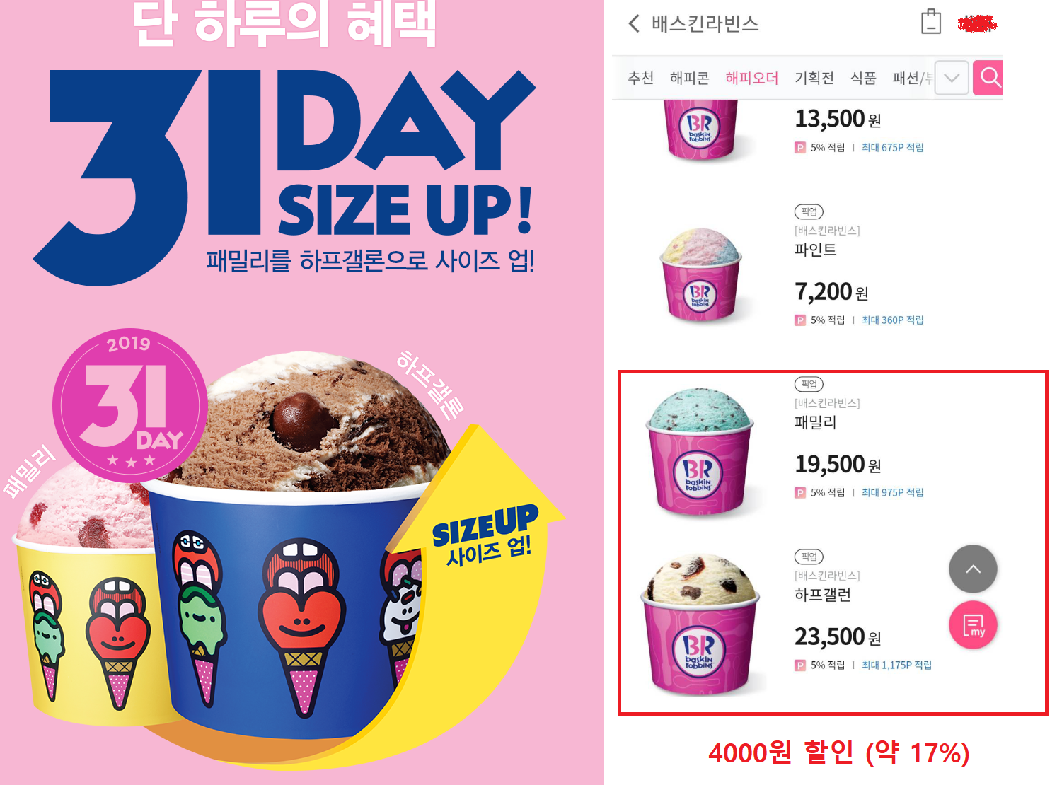 가격이 패밀리가 1.95만원이고 하프갤런이 2.35만원이니 4천원할인... 약 17%의 할인율을 갖는다.