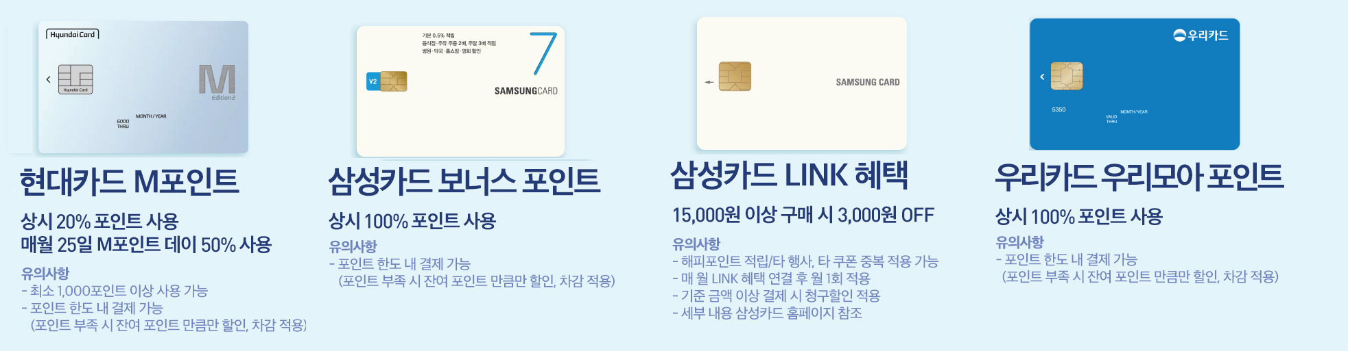 - 삼성카드 : 상시 100% 포인트 사용가능 (LINK 이용시1.5만원에 3천원 할인 ... 삼성카드 링크)