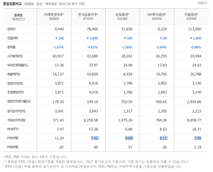 미래에셋대우 주가가 최근 급등해서 그런걸수도 있을테니... 일업종 비교를 해서 보정해서 가격을 비교해봤다.