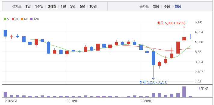 월봉을 보면 계속 계단식 하락을 하는 추세였는데...