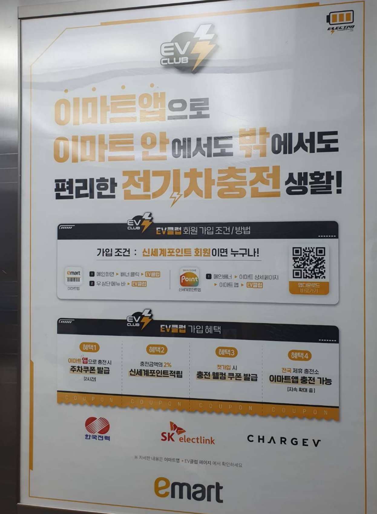 추가로 이마트앱에서 전기차 충전도 지원되나보다. EV 클럽이라는 이름인가 본데, 가입하며 장점이 충전시 이마트 2시간 무료 주차쿠폰을 준다는 점이다. (evsis 는 롯데마트 무료 주차를 제공하는데 둘이 경쟁인건가?)