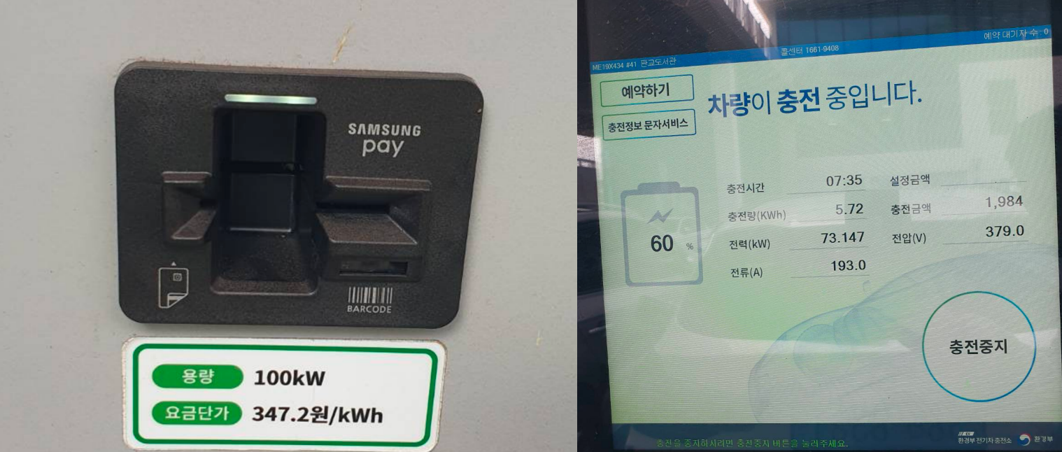 판교도서관에 있는 전기차 충전소는 급속 100kW 만있다. 대신 갯수가 꽤 많은편이라 급할때 근처라면 가볼만 하다.
