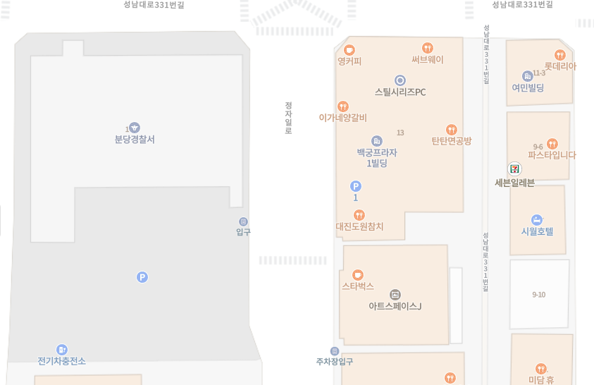 우선 충전소 위치는 지하철 정자역에서 걸어서 5분거리 이내이며, 분당 경찰서 가장 안쪽에 있다. (입구의 대각선 안쪽이라고 할까?)