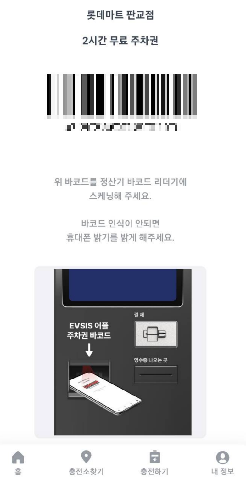 로밍이 아닌 evsis 회원카드로 결제하면 앱에서 주차권 발급이 가능하고, 이런 바코드를 주차정산기에 인식시키면 무료 주차가 가능하다.