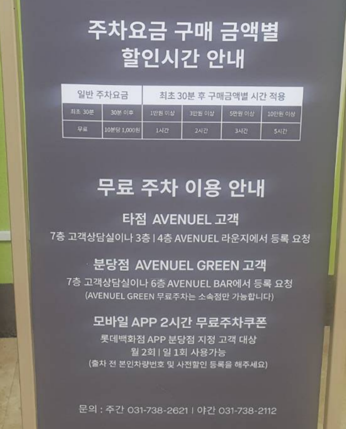 우선 나는 롯데백화점 MVG 퍼플등급이라 주차비가 무료이다. 그리고 롯데맵화점 앱을 설치하면 2시간 무료주차권을 매월 2장을 주기 때문에 잠깐 사용한다면 무료로 주차장을 이용할 수 있다. 기본적으로는 최초 30분 무료후 10분당 천원이라는 비싼 주차요금을 받는데, 사실 3만원만 구매해도 2시간 무료주차가 되므로 주차 자체는 크게 부담되지 않는다.