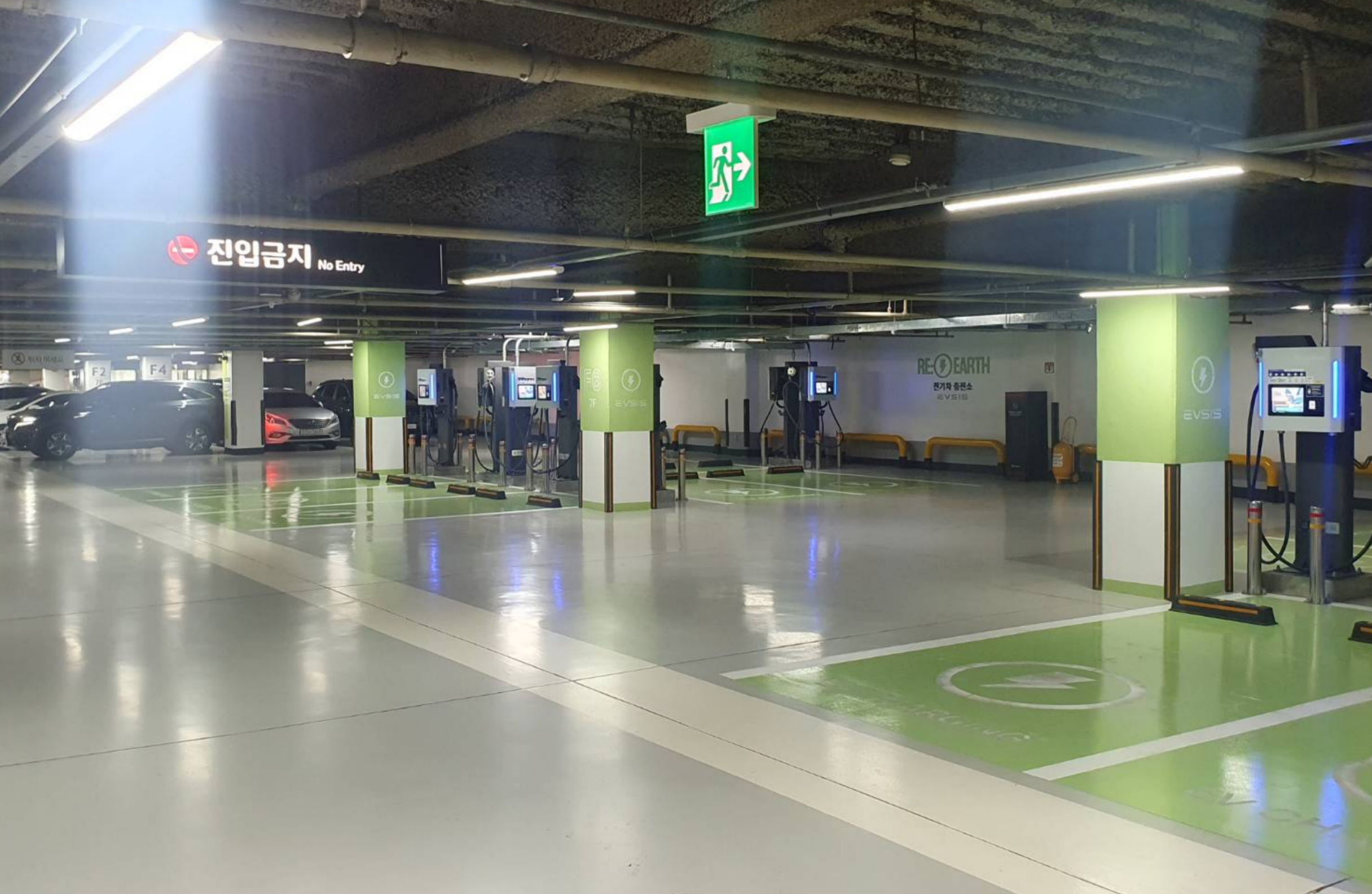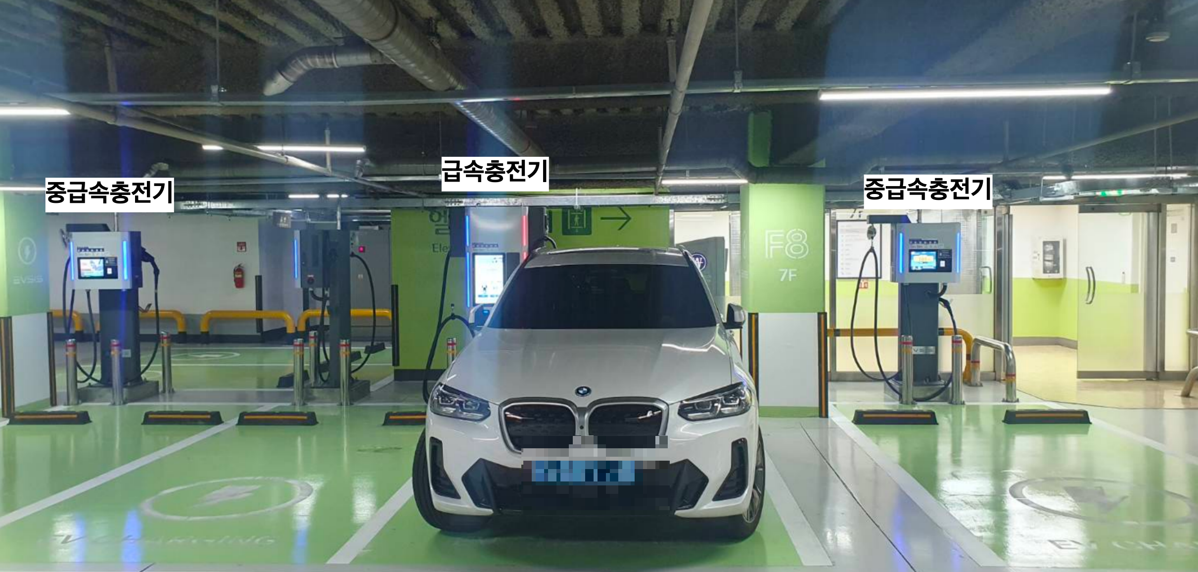 참고로 급속충전기 위치는 엘리베이터 입구 옆옆 위치에 존재한다. 급속충전기는 양팔형이고, LCD 도 세로로 긴 형태이다.