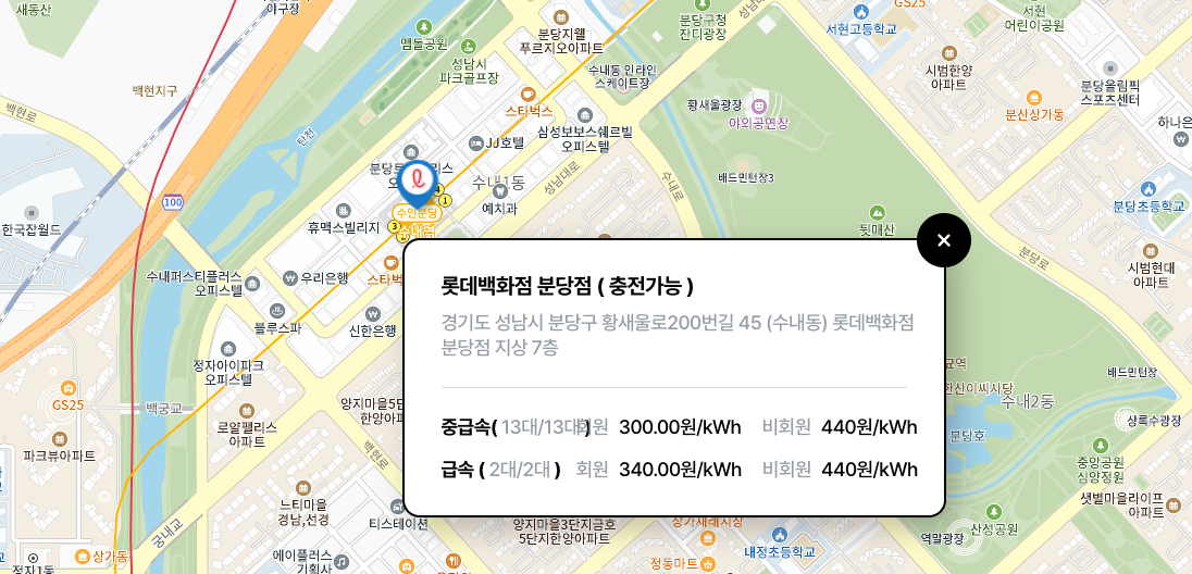 롯데백화점 분당점은 수내역에 있고, 충전소는 지상 7층에 있다. 티맵에서 "롯데백화점 분당점 전기차충전소" 혹은 "그린(지상)주차장" 을 찍고 오면 된다. 참고로 여긴 완속은 없고 중급속과 급속이 있는데 급속은 1시간 이상 점유를 못하기 때문에 쇼핑 하면서 충전하려면 25kw 인 중급속 충전기를 사용하는게 유용한다.