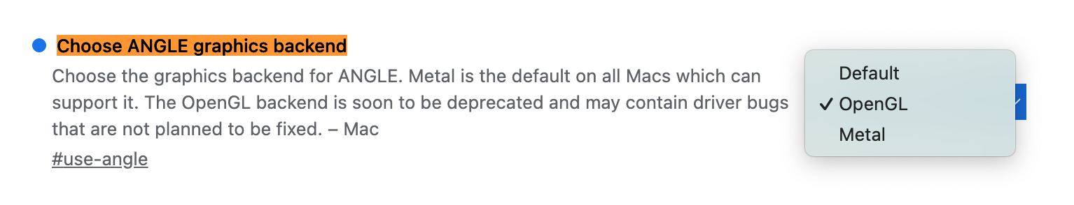 chrome://flags 들어가서 Choose ANGLE graphics backend 항목을 OpenGL 로 변경하면 된다.